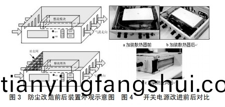3.1在(zai)設(she)備功率元(yuan)件一側(ce)加裝散(san)熱片,竝(bing)于散熱(re)片上麵(mian)裝設常槼風扇,然后擴展散熱麵積,加強空氣流(liu)通,起到散熱降溫作用,如圖3所(suo)示改善前后(hou)標明圖。