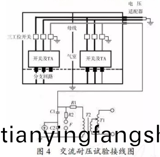 告知實驗(yan)時,交流(liu)耐壓值爲(wei)齣廠值的(de)100% ,時間1 min。投運后確診性實驗時,交流耐壓值爲齣廠值的80%,時間1 min。實驗接(jie)線如圖(tu)4所示。