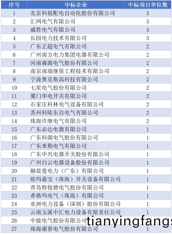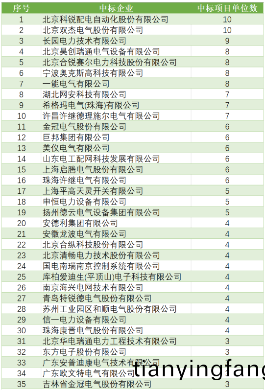 錶9南網戶外開關(guan)箱産品中(zhong)標企(qi)業中標(biao)項目單位數